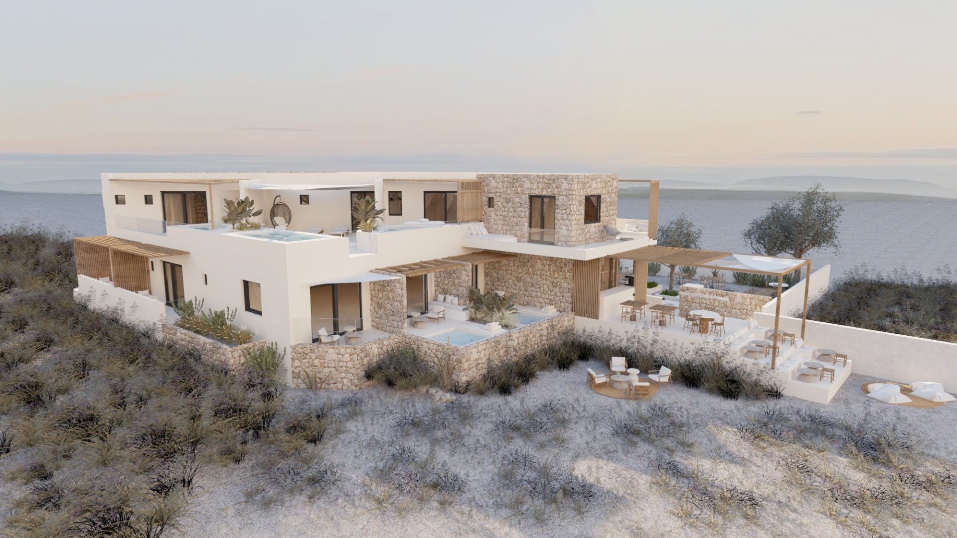 The Signature Suites at Enplomare are the ultimate sanctuary of refined calm and discreet luxury. With clean lines, natural materials, and panoramic sea views, our suites offer a unique stay experience that soothes the eye, embraces the body, and calms the mind. Every detail exudes a signature of hospitality that needs no words to be felt.